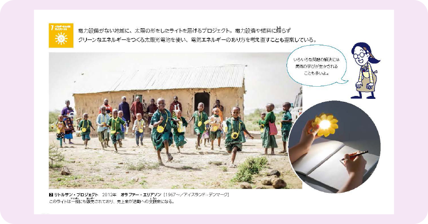美術の学習が、身近なSDGsの活動や豊かな社会の創造につながっていることを意識して、教科書全体を 編集しました。SDGsに関わる活動を幅広く取り上げ、マークをつけてわかりやすく示しています。